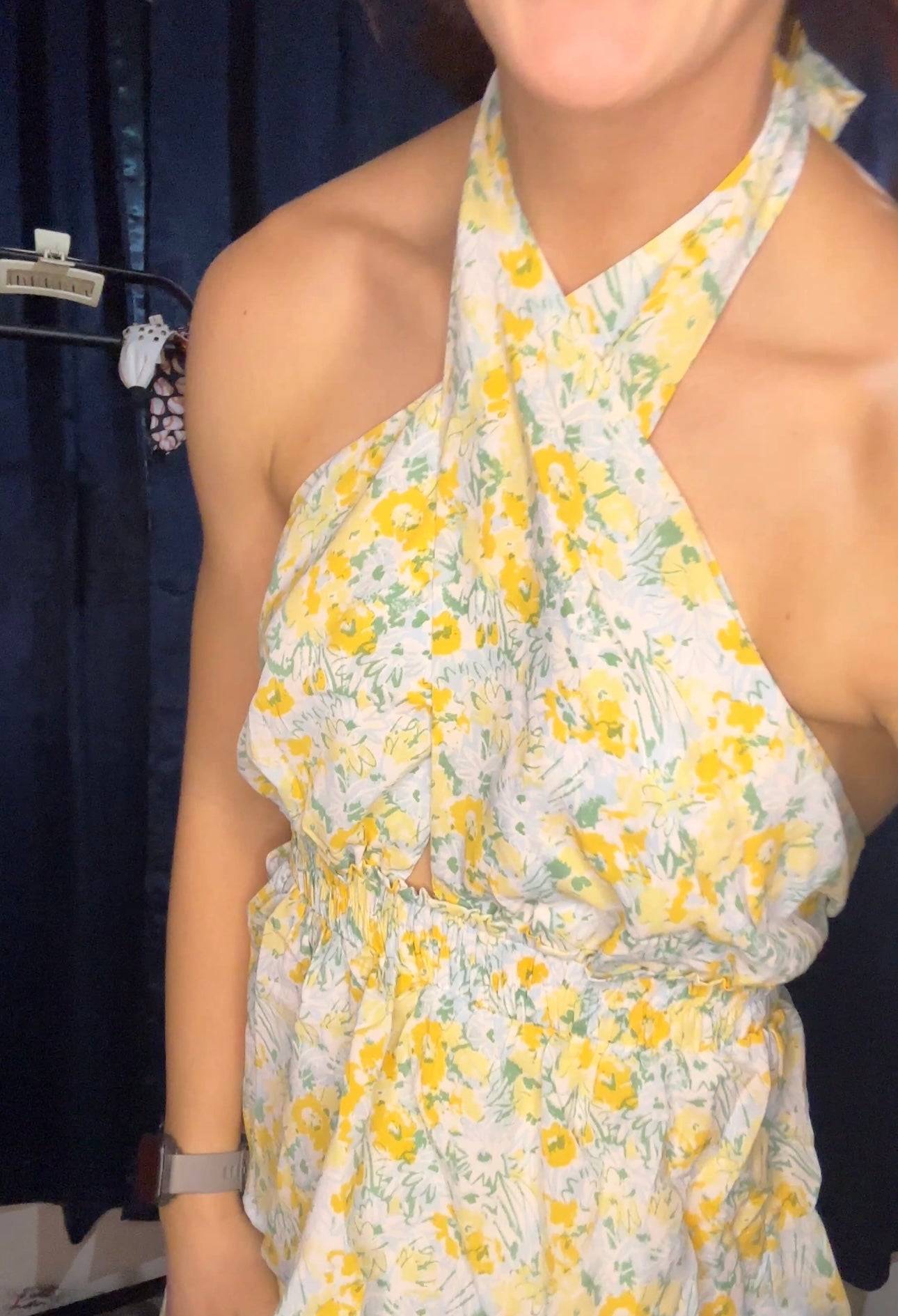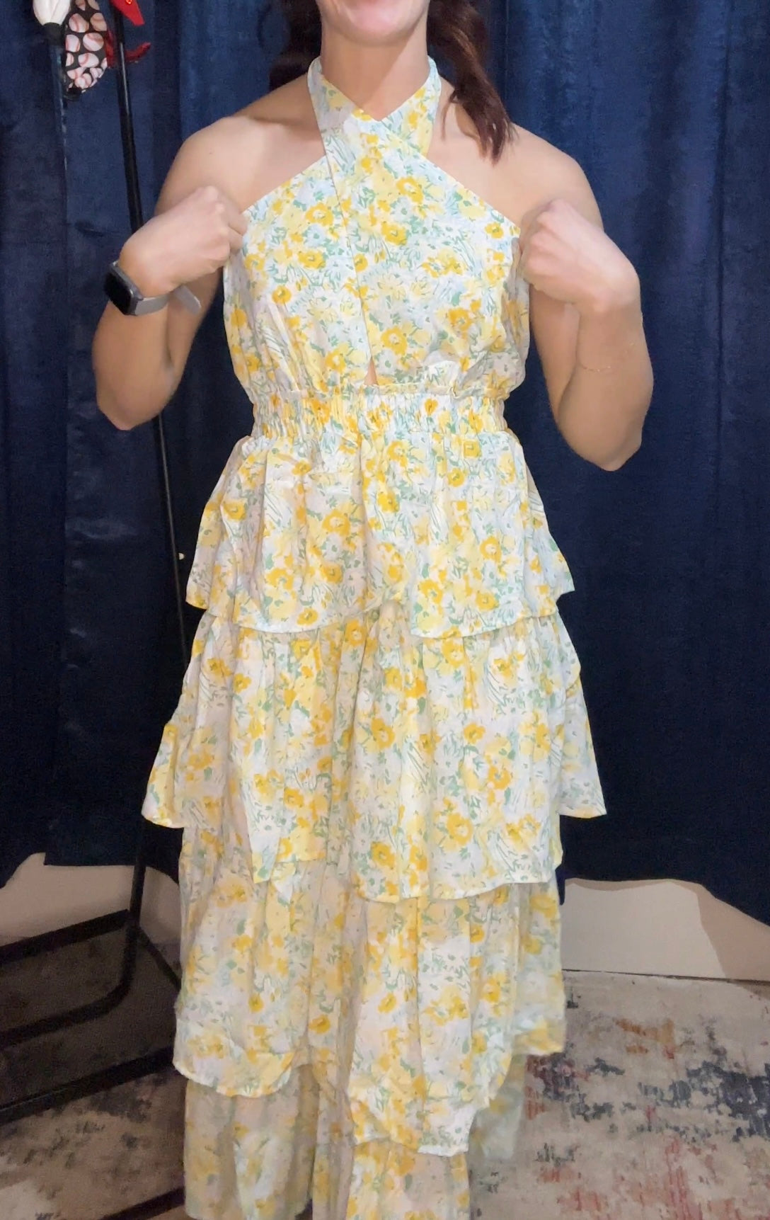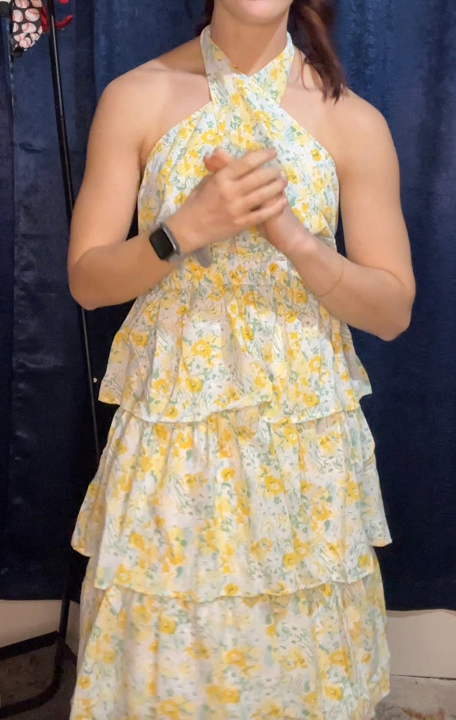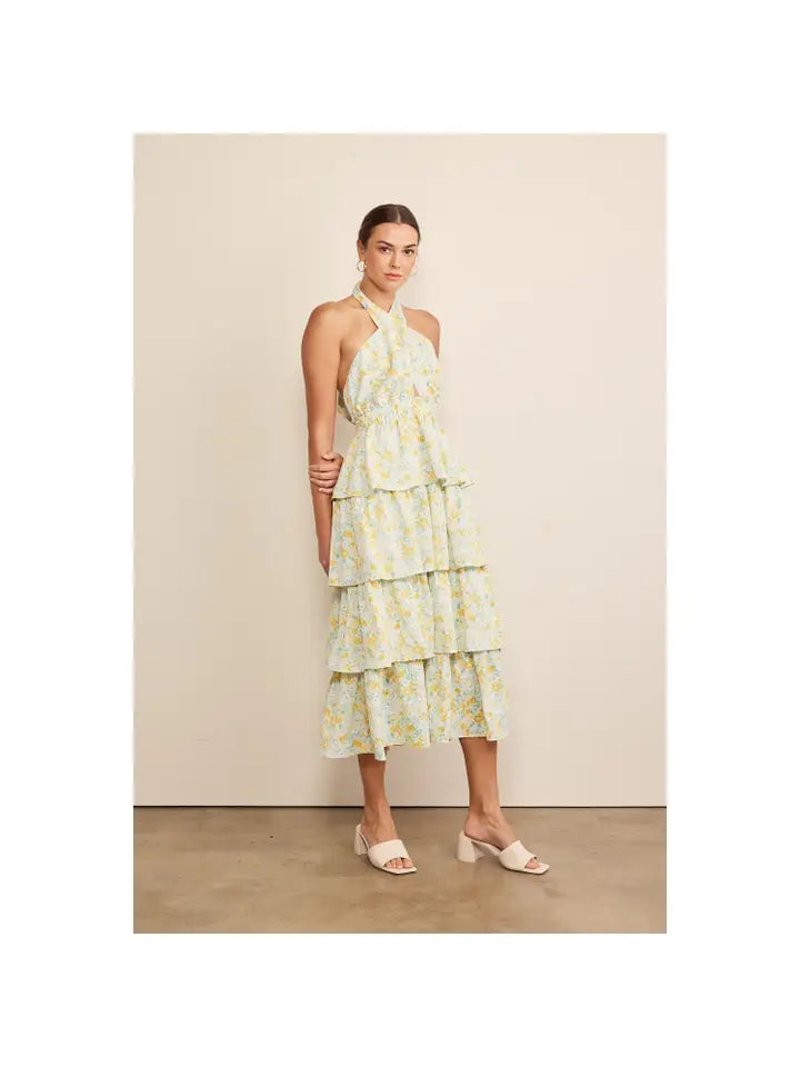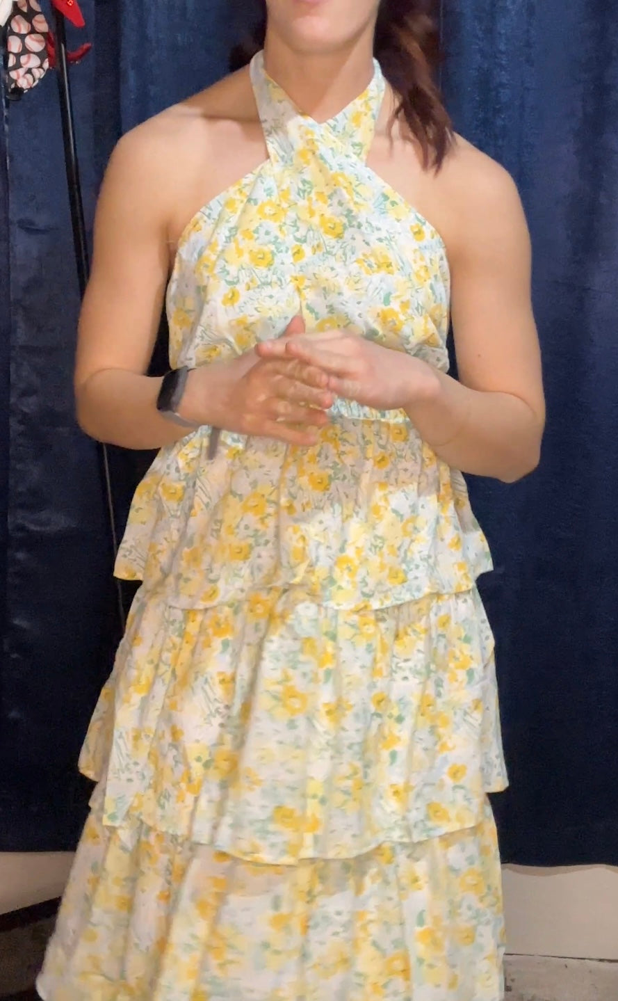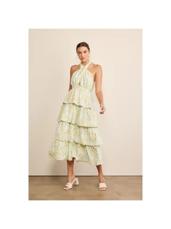 The tiered bottom adds a playful and whimsical touch, while the crossover halter neckline enhances the dress's elegance and sophistication. Whether you're attending a garden party, a tea party, or any spring or summer event, this dress exudes effortless style and grace.