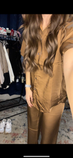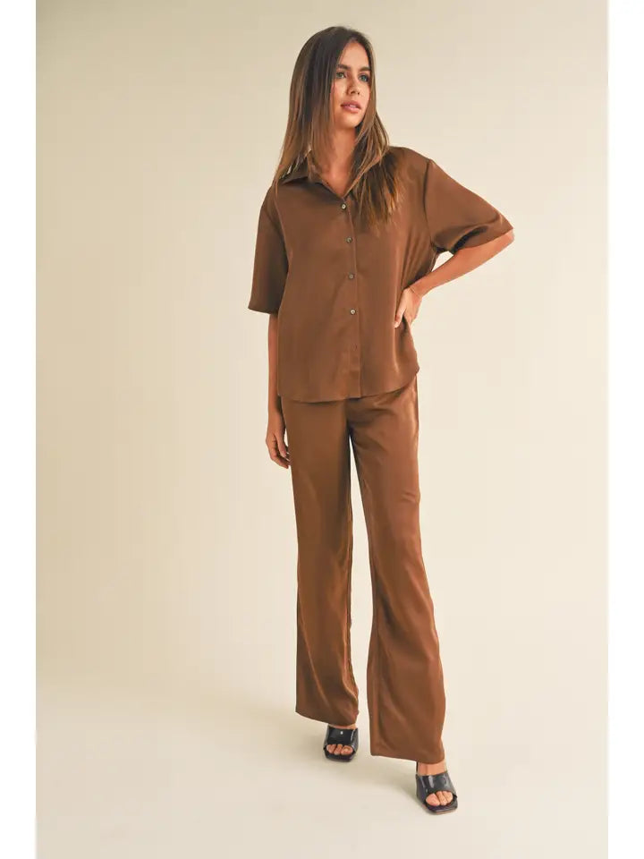 The satin fabric drapes beautifully and feels incredibly soft against the skin, ensuring all-day comfort whether you're at work, lounging at home, or jetting off to your next destination. The straight-leg bottoms provide a relaxed fit that flatters, while the button-up shirt adds a touch of sophistication.