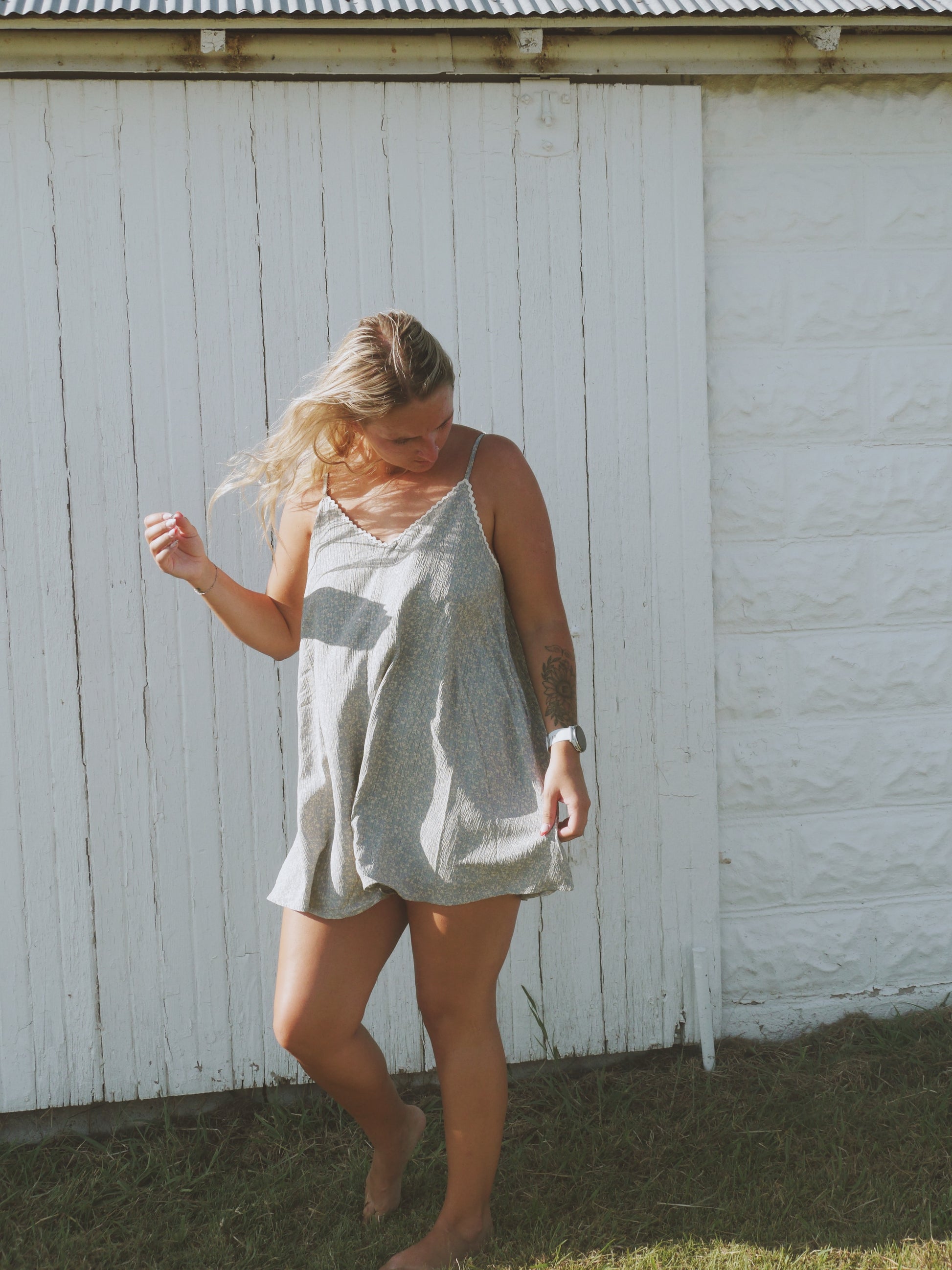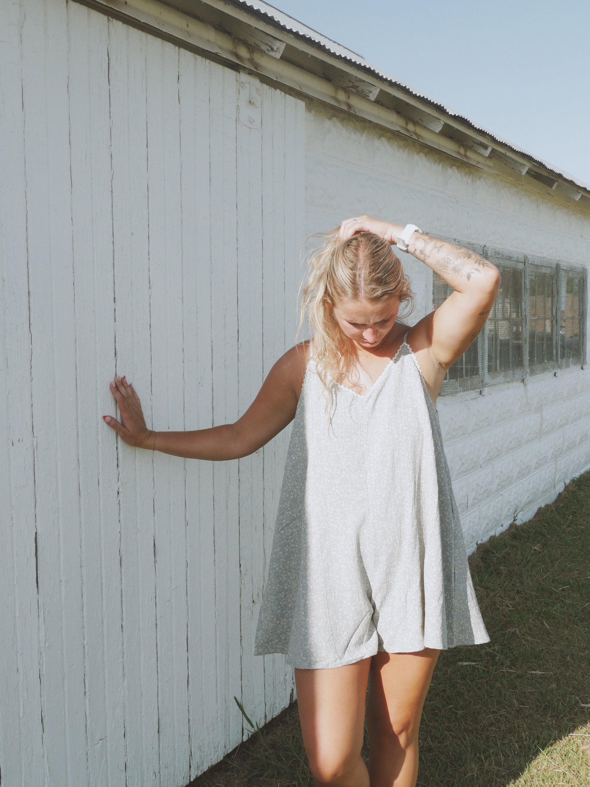 The Seaside Whisper Romper is the perfect addition to your summer wardrobe! This playful romper features a beautiful dusty blue color and delicate small florals. With adjustable spaghetti straps, it offers both style and comfort.