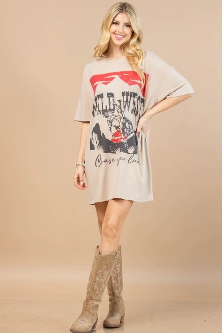 Saddle up and ride into style with our Wild West Graphic Tee Dress! This versatile piece is long enough to wear as a dress, or try it out over shorts for a casual, cute look. You can even tie it up with jeans for a trendy twist. Perfect for rodeo season and beyond.